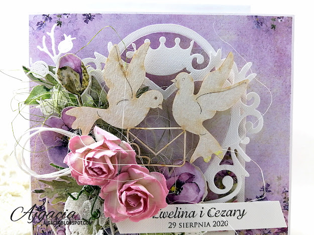 Cześć, dziś kolejna praca ślubna. Wykorzystałam kolekcję papierów ScrapAndMe i ślubnych tekturek Crafty Moly. Przygotowałam kartkę w pudełku. Para miłosnych gołąbków świetnie wypełnia środek kartki i dodaje jej tej romantycznej duszy. Na pudełku powtórzony jest motyw z sercem, a w centrum umieszczony napis "W dniu Ślubu".